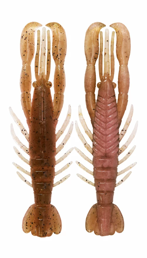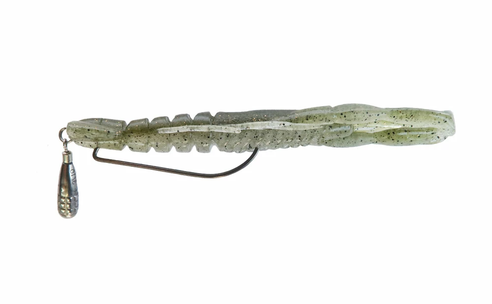 The Bottom Up Hurry Shrimp imitates the delicate behavior of shrimp with a natural micro-vibration that strongly stimulates a bass’s predatory instincts. The claws vibrate at high speed during falls and swimming. The thickness and length of the body and legs were carefully examined during designs, and slight vibrations are made at every invitation. In particular, the action of slightly vibrating at an ultra-high pitch with no sinker fall imitates the shrimp rushing to scratch the water and drift. The tail, which looks like a fan, blows water and causes water push. In a no-sinker rig, it also acts as a water receiver that creates a kickback movement by bending the body into a dogleg. use it on a Texas Rig, Down Shot, neko rig, or remove the tail and you have an excellent jig trailer or no sinker rig.