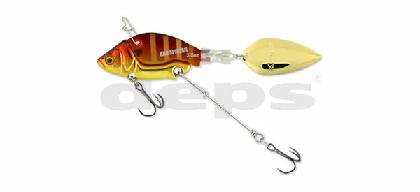 Deps set out to create the greatest tail spinner of all time, and the result was the KRO Spintail! Â The KRO Spintail is made of half lead and half circuit board, which gives the bait a tremendous tight vibration. Â The unique shield-shaped blade is designed to spin effortlessly with very little water resistance and is attached to the bait with a ball-bearing swivel, which allows the blade to spin more rotations than any other tailspin. Â Finally, you will notice the drop-down rear hook. Â Deps discovered in testing that a lot of tail spinner bites happen at the blade, so they designed this hook to swim underneath the blade to all those short strikes are now hook-ups!