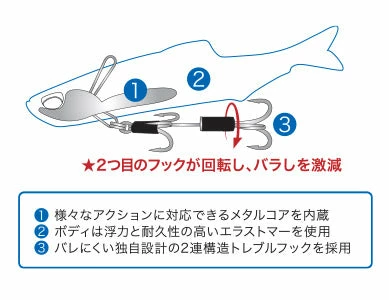 Building off the popular Nomase Wakasagi platform, the new Nomase Kozakana adds an internal harness with dual external hooks for better hook-up ratios during a straight retrieve! Â The Nomase Kozakana is a soft bodied lipless bait that vibrates hard as it comes through the water. Â The rear treble hook is attached to a swivel also so short strikers get pinned and stay pinned. Â The soft body is made of an elastomer plastic so it has great durability. Â Designed for freshwater and saltwater use, the Nomase Kozakana features saltwater safe hardware and internals. Â Toss this at a boil or run it over the top of grass or around shallow water and hold on!