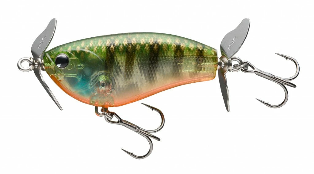 The Ima Helips is a floating prop bait designed with 2 squeaky props, one in front, and one in back, built to churn the water as it moves across the surface making it perfect to work over shallow cover or around bedding bass.Â
