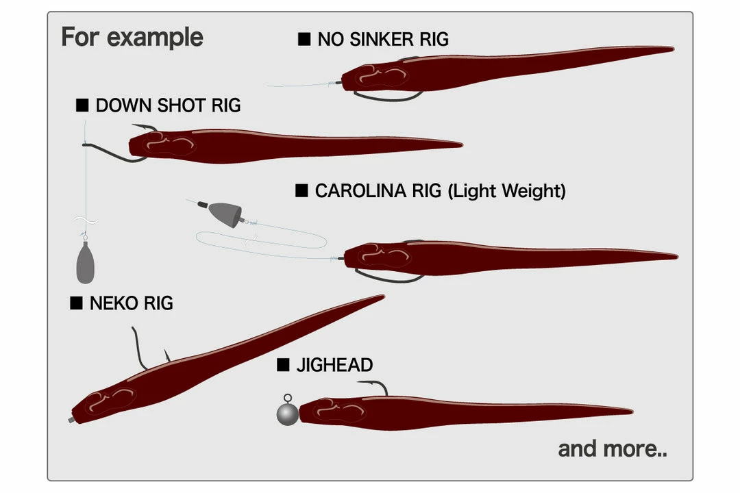 | Option | Dark Melon Pepper, Ebimiso Red Flake, Light Watermelon, Live Wakasagi, Scuppernong, Solid White, Aurora Shad, Bed in Pink, Doba Mimizu, Solid Chart, Cinnamon Solid, Ghost Shad Solid |