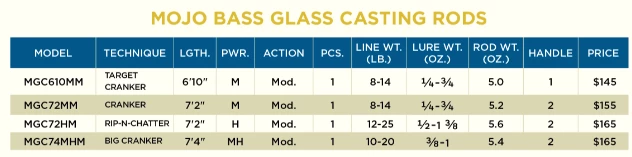 Mojo Bass Glass rods are revamped and improved for 2020. Now featuring St Croix’s exclusive integrated Poly Curve (IPC) mandrel technology and combined with super premium, 100% linear S-glass, these rods provide exemplary performance with all crankbaits including square bills, lipless cranks and chatterbaits. They excel with lures ideally matched to a moderate action rod.